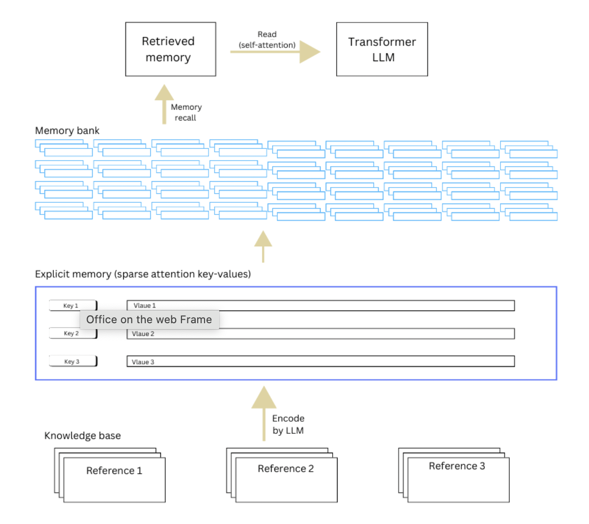 All the processed key-value pairs are stored in a memory bank, functioning as an external storage unit (such as SSD, RAM, or a database). This memory bank is distinct from the model’s parameters and acts as a scalable knowledge repository.